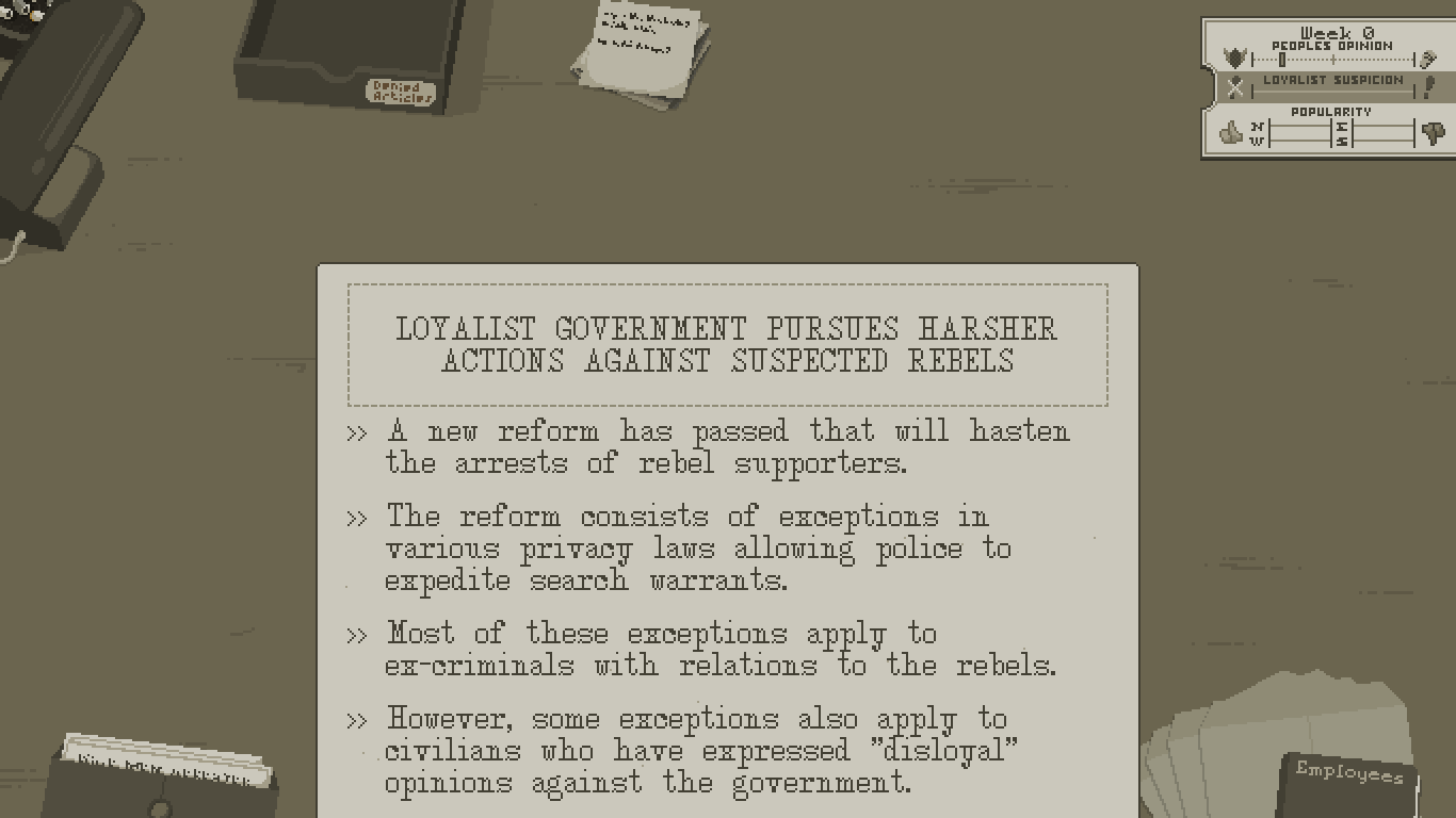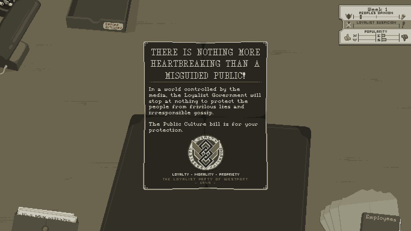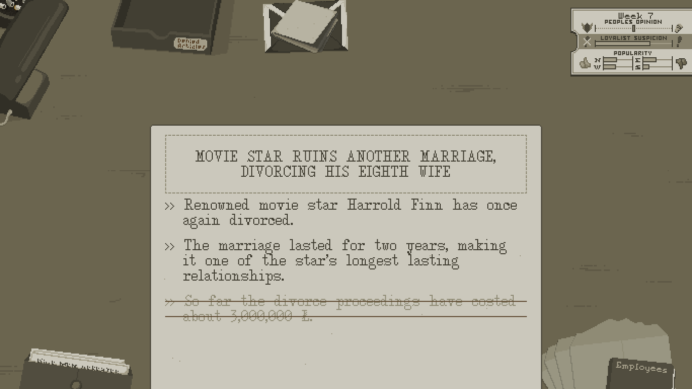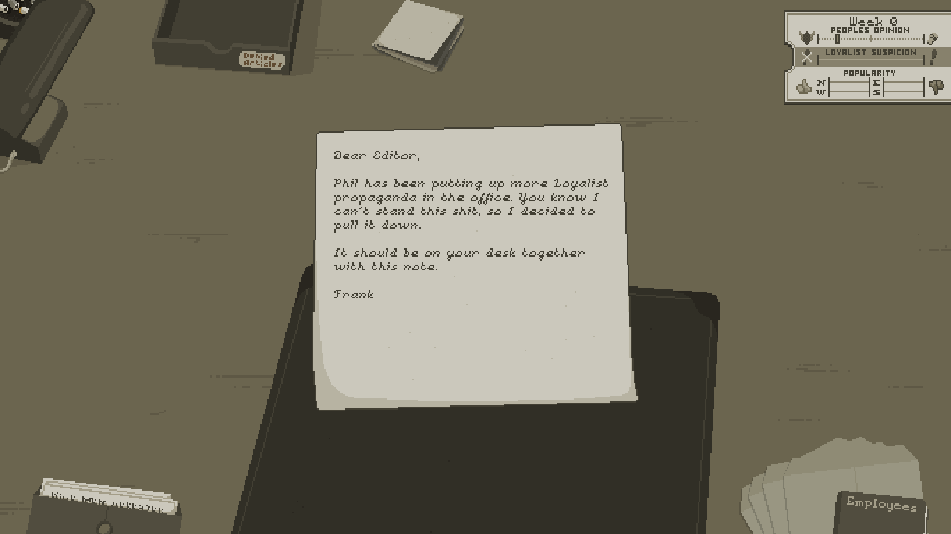 The game clearly wants you to think about the impact of information and how easily it can be manipulated and framed in different contexts, which the mechanics nail down hard. Your job is to assign your four reporters on various stories in a pool of possibles, each reporter having their own political alignment from left to right. They’ll actually turn down stories that don’t fit their worldview, and their politics can be influenced slowly on the stories you have them on. This impacts the ending and if you even have certain reporters on staff, as they can be arrested, quit, or just be generally harassed and may be out of the office for a week or two.