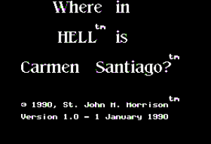Broderbund’s Carmen Sandiego educational series was immensely popular in the late 80s and early 90s, enough to eventually earn it a PBS gameshow and an animated television show. Each of the games featured the locale where eponymous criminal and her gang would travel, first starting with the entire world, narrowing it down to the United States and Europe, then broadening it through time and even into outer space. A common joke (or utterance of frustration) for gamers was, “where in hell is Carmen Sandiego?” or “Where would Carmen Sandiego show up next, hell?”. One developer, St. John M. Morrison ™, decided to take that literally for their own parody game, Where in Hell is Carmen Santiago?, where the world/time traveling thief (or rather, a similar but legally distinct facsimile named Carmen Santiago) ends up dying and being sent into the underworld, with you having to track her down. The game was not a retail product, but was instead distributed as shareware, typically through computer shows and other community efforts.