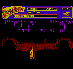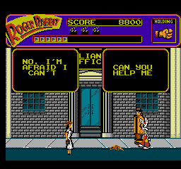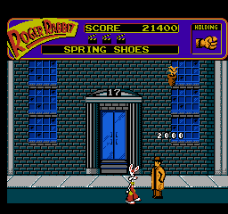 You start the game out in Eddie’s office, where you can search cabinets and mouseholes, which always takes several seconds to process for some reason. Then when you get outside, you can take a wallet for trading at shops, but a potted plant will drop down, and you instantly lose a life if it clonks you. No lifebars, just lives, which really bites considering how easy it is to be killed by a passing rat or snake. There are animals just about everywhere you go who leap at you if you get too close, and they sometimes guard helpful items, so you need a corresponding distraction item to lure them away. However, you’re not told where to go for these items, amounting to a bunch of pointless searching in various apartment rooms. The overhead map perspective gives absolutely no indication to what you’ll expect from a building except its size, and while it may be too much to ask from eighties NES technology (albeit late eighties), some sort of map or indicator for your goal would be really helpful. You’re supposed to find all four pieces of Marvin Acme’s will and eventually defeat Judge Doom, but figuring out where to go is on par to most Sierra games, if not even worse.