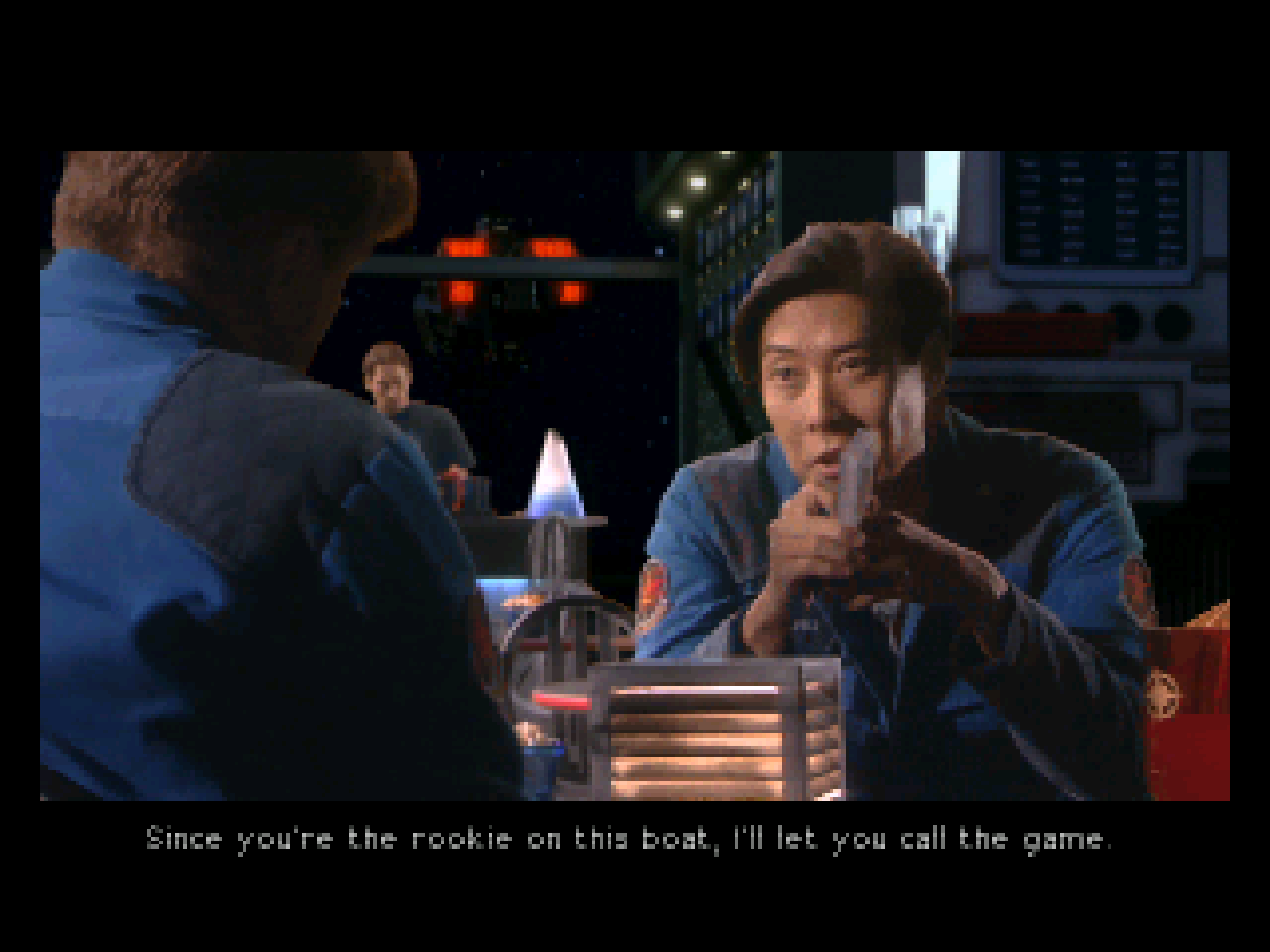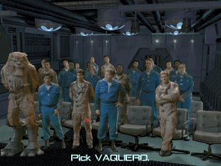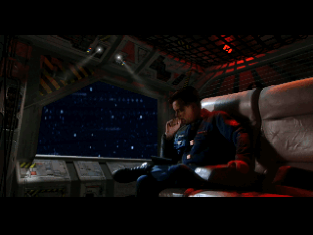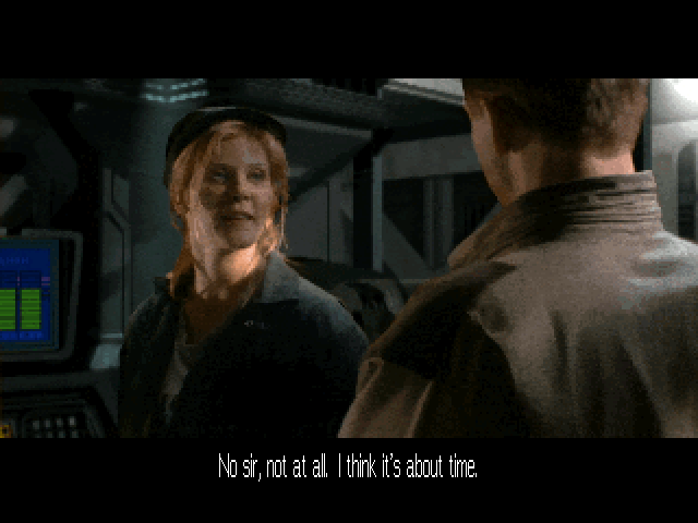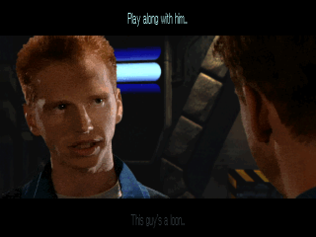 This leads us to the headline feature of the game: those juicy, live-action FMV cutscenes. Following in the footsteps of Strike Commander, the keyword is once again ‘immersion’. Instead of a single pre-mission story scene before the briefing, the player can now freely wander the Victory and engage in conversations with wingmen and crew members.