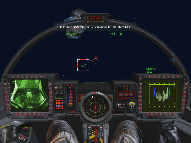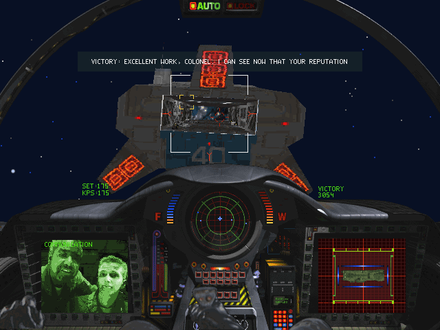 The leap from Wing Commander II to III feels enormous, even with the ‘missing link’ that is Strike Commander. It almost feels ludicrous that we went from mute talking heads and short pre-mission cutscenes to full-motion video and a complex storyline where choices outside the cockpit can affect both story events and relationships with other characters. On release, the game felt like an incredible jump in gaming technology. Origin and EA pulled out all the stops with the box contents too, indicating their confidence that this was as momentous a game as the original Wing Commander: Ship blueprints, a manual themed as an in-flight magazine, and an enormous poster were all included. While Wing Commander III is often discussed in terms of its FMVs, it is still a space combat simulator first and foremost, and in this aspect it does not disappoint. Flying feels more natural and balanced. Weapons fire has greater weight and precision, giving the player a sense that if they didn’t hit a target, it was their own fault. The game feels somewhat easier than its predecessors, but that could be ascribed to the dev team’s focus on fairer challenges. Capital ships, for example, require a more surgical approach than in previous games, where they were more like eldritch bosses to hit and run. Players take out turrets one by one, and can then deal with carrier fighters inside the hangar bays for ships that hold them. It’s a palpable difference.