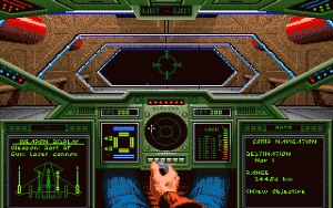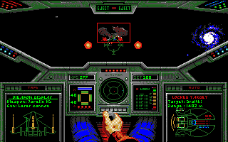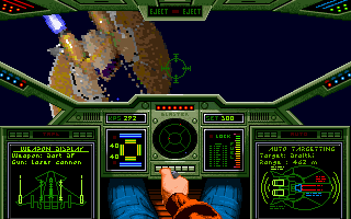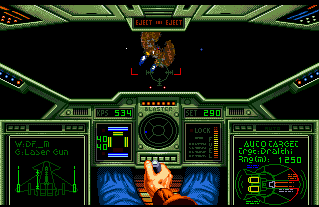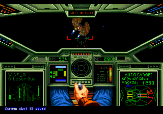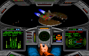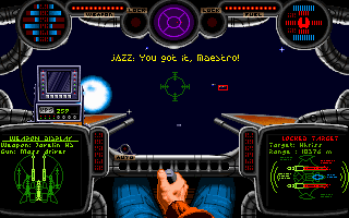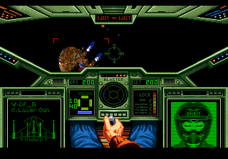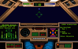 There are four fighter ships you can pilot, each assigned to you for a given mission, and differ in shields, armor, maneuverability, and weaponry. Shields surround the four sides of your ship, and they slowly regenerate after being hit. Your armor does not, though, and taking too many hits will not only affect your systems and weapons but will eventually destroy your ship. Your main weapons are energy based, including the lasers, mass drivers, and neutron guns, the main difference between them being their maximum range and their damage output. Missiles are limited, and there are a few different kinds, some of which are just lobbed forward directly (and are really only useful for taking down large targets like capital ships) and others can home in on enemy (or even friendly) targets with varying degrees of success. While it does use plenty of keys on the keyboard for switching weapons, bringing up targeting systems, communicating with other ships, and so forth, owing to its arcade-y nature, it’s much more approachable than the average flight sim of the era.