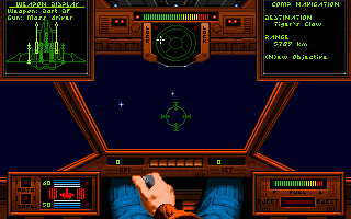 The first Wing Commander’s storyline is, admittedly, much more basic than future installments. The fact that a game not in the adventure or RPG genres had any sort of characterization and storytelling to this level, no matter how two-dimensional, was innovation enough. Essentially, the player flies missions of a few distinct types: patrol, search-and-destroy, and escort. Every few missions, the player’s carrier, the TCS Tiger’s Claw, will jump to another star system, which the game would pick based on your performance.