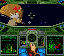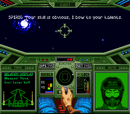 In 1994, the game was ported to the Sega CD system by Game Arts. Despite the lower color depth, it looks much closer to the PC version than the SNES game, and now included newly recorded dialogue for both the cutscenes and all of the conversational chats. This meant the player is no longer able to rename the main character, whose name and callsign are both ‘Hotshot’. The music for this version is completely original, most of it using the Sega CD’s strong PCM sampling, so it sounds stronger than the average Genesis soundtrack. It was composed by Two-Five, a music studio who worked on the Lunar games, among others. Unlike Wing Commander II, whose voice cast was made up of Origin staff, the Sega CD port of Wing Commander features professional voice actors, such as the rather ever-present Cam Clarke as Colonel Halcyon. It’s generally well done, but between the low sampling rate and the thick accents, coupled with the lack of subtitles, it can sometimes be hard to understand what’s being said.