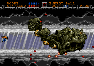 After the first cave level, you navigate above (and within) a river, the inside of a castle, an industrial factory, the inside of a pink organic something-or-other (maybe a womb?), and finally the clouds. The locales and regular enemies,which come in all manner of variety and sizes, are actually pretty tame, at least compared to the bosses.