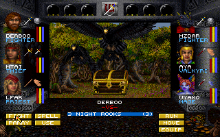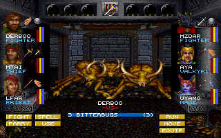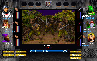 Once landed on Guardia – the starting location also depends upon the Wizardry VI ending – things look fairly medieval fantasy-like again, though. Most of the planet surface is covered by woods, with a few towns and dungeons in between. Aside from the robotic Savants, the planet is populated by a bunch of monks, the hoverbike-riding Helazoid amazon warriors, the Rattskins (nomen est omen) and the Gorns, who are totally not Orks and live in castle Orkogre, to make sure everyone perfectly understands that they are neither Orks, nor Ogres. But the center stage among the many peoples of Guardia is taken by the conflict between the two major spacefaring races, the humanoid rhinozeros race of the Umpani and the local dispatch of the arachnid-crustacean T’Rang Empire.
