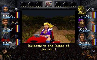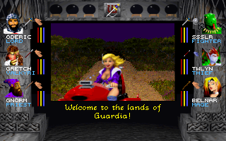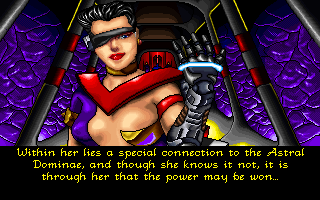 At least that is the story when starting a fresh game. After Return of Werdna and Heart of the Maelstrom had been standalone adventures, Wizardry VII once again allows to import a completed save from the previous game. Depending on the ending reached in Bane of the Cosmic Forge, the means by which the party travels to Guardia differ. They might instead get picked up by the Dark Savant, who tries to get them on board for his quest to end the tyranny of the Galactic Council. On his ship the party also meets the mysterious Vitalia Domina in person, a women wielding a power glove, who somehow is the key to reaching the Astral Dominae.