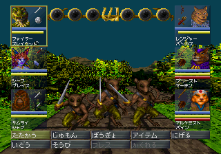 The Saturn version has the same polygon engine, annoying menu navigation and load times as its bundled predecessor. The enemy graphics and character portraits, on the other hand, remain identical to the DOS version this time. It has much better music than Wizardry Gold, but no voice over. The cut scenes are also the same as the original, but still presented in ugly, lossy FMV sequences. The PlayStation version by Soliton – actually the company’s first Wizardry port before Legacy of Llylgamyn – released with the subtitle Guardia no Hōju (“Jewel of Guardia”) has much better looking 3D environments, but uses anime style character portraits and pre-rendered graphics for the monsters and cutscenes. While the game itself uses text only, it has a voiced intro, which curiously is in English but does not use the same recording as Wizardry Gold. It isn’t any better, though.
