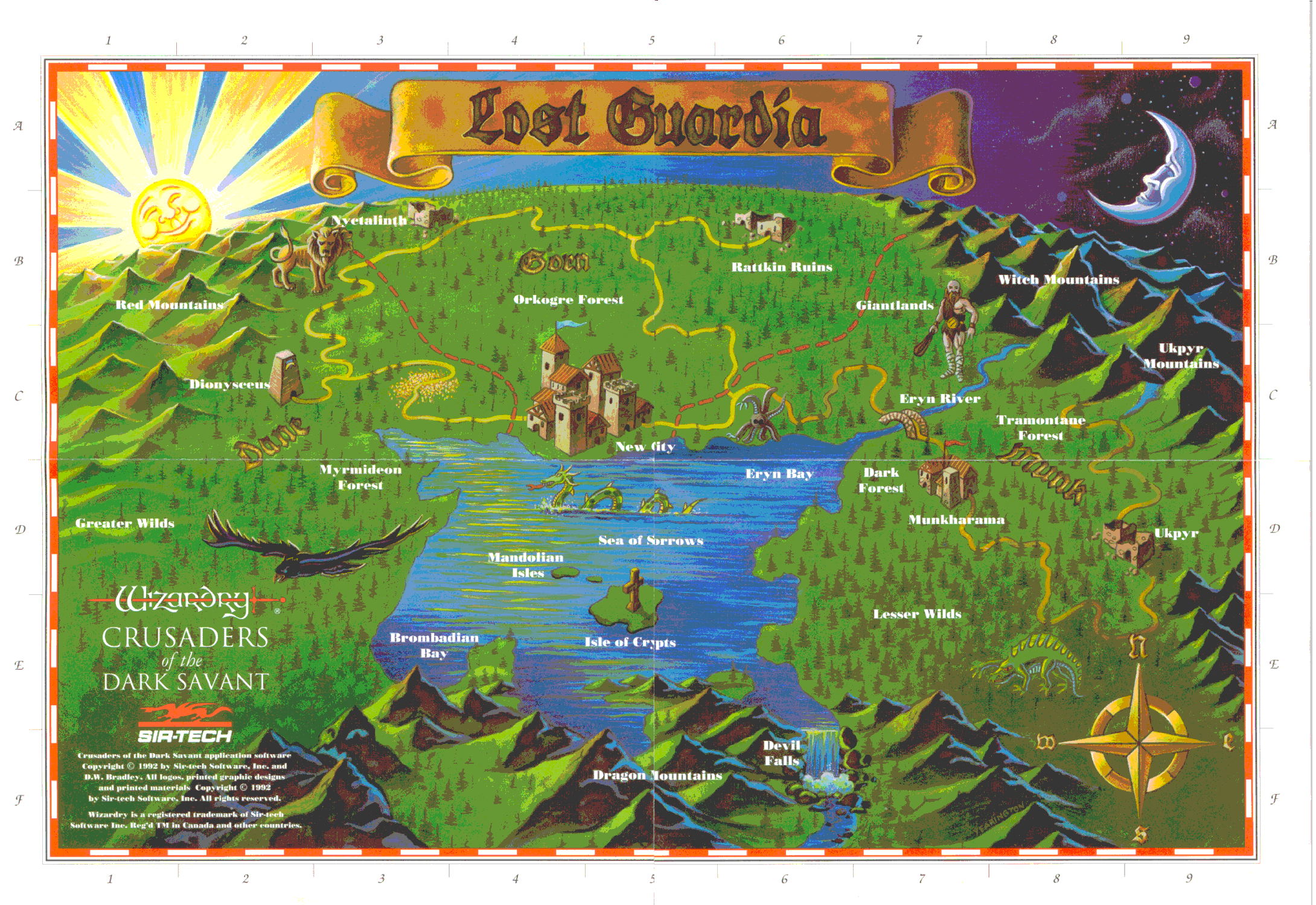 Wizardry VII was widely considered as D.W. Bradley’s masterpiece and one of the crowning achievements from the era of classic turn-based CRPGs. It was also the largest Wizardry game until then by a wide margin, and no longer a mere dungeon crawler. The huge size comes also a bit to its detriment, though. The overworld is so enormous it’s almost impossible to properly map it. Apparently it’s possible to get by with 79 sheets of 20×30 grid paper when drawing the maps in the most economic way possible (that’s the amount of maps that accompany the most common walkthrough for the game). In a tiny hint of mercy, it is the first game in the series that originally featured an automap feature, although the party first has to find a map kit and train one of the members in the new map making skill. Looking at the map is quite inconvenient – it’s necessary to select the “use” item option, choose the correct character, scroll to the map kit and then activate it. It also only ever shows the close vicinity. To get an idea where the party is located in the world it’s necessary to compare with the rough overview map packed with the boxed release, which in turn doesn’t show any details.
