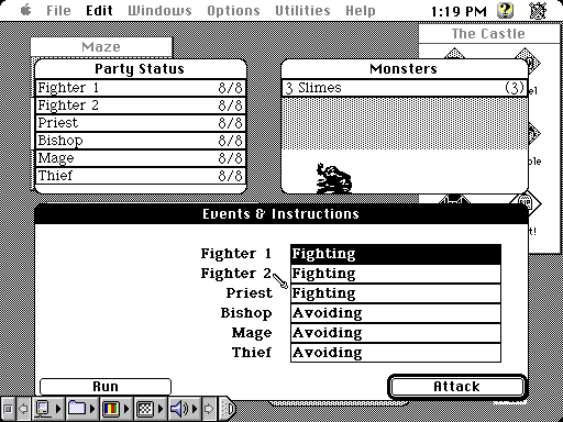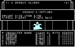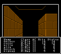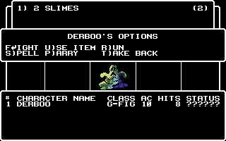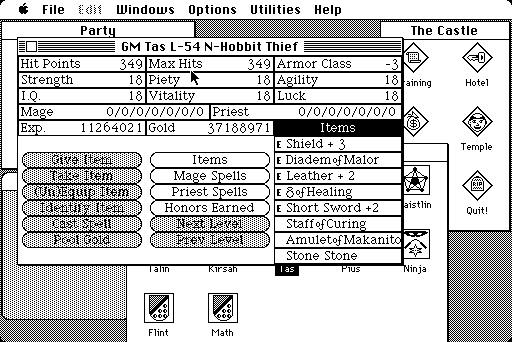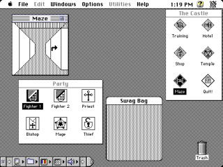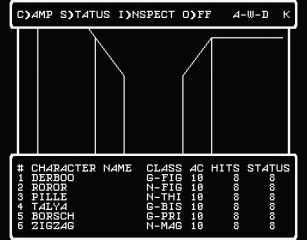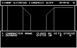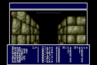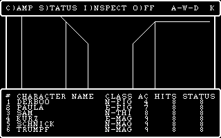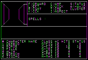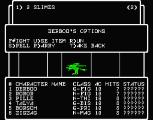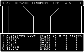 According to an interview Woodhead gave to the magazine QuestBusters in March 1987, the plan was to bring Wizardry to all the Western home computers as well, including the Atari ST, Atari 800, Amiga and C64, but only Commodore’s 8-bitter did get it in the end. The Apple Macintosh version didn’t use the virtual machine, but got completely new graphics and a new engine embedded in the Mac OS built-in interface. This version was the most user friendly for a number of slick-interface-related reasons (especially combat was much faster thanks to drop-down menus with typical default selections for the entire party). But its greatest advantage was the ability to save inside the dungeons and then go back to that party later, eliminating the need to get back to the town each time before quitting the game.