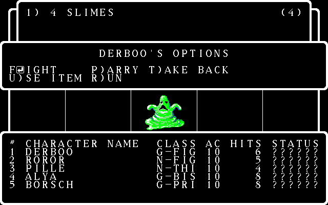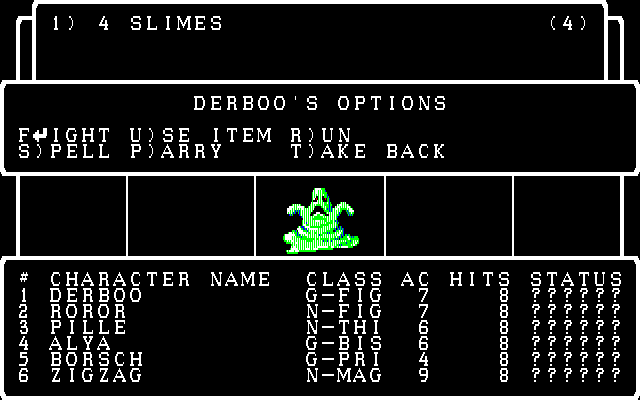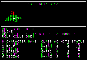 At first, Wizardry wasn’t much of a multiplatform title – it remained a system exclusive to the Apple II until after Legacy of Llylgamyn introduced the new windows-based interface, which was then used for almost all ports of the first two scenarios as well. In 1984, Proving Grounds of the Mad Overlord was finally ported over to IBM PCs, not to be run in an MS-DOS environment, but booted directly from disk. It introduced all new monster graphics which were then used for subsequent home computer versions. In cooperation with a Japanese team at ASCII, Robert Woodhead created a kind of virtual machine especially for Wizardry, to make porting it to individual platforms much easier. ASCII brought the game to pretty much all home computers out in Japan. Since they were all running on the same basic engine, they only differed in graphics, which look best on PC-9801 thanks to the higher resolution. These new versions also had a number of balancing differences to the original Apple version.
