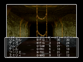 The Story of Lllylgamyn, which combines all three episodes on the Super Famicom, was released only for the Nintendo Power flash cartridge in Japan, and came astonishingly late – it became available in 1999, even after the Saturn and PlayStation compilations. But it is easily the best version, as it has the most beautiful graphics and solves the problem of thieves being useless in combat by including the “hide in shadows” skill that was first introduced in Wizardry V. It also displays an icon next to characters that are ready to level up, and makes things much more comfortable by providing an automap for casters of the DUMAPIC spell instead of just putting out the current coordinates. Soliton’s Llylgamyn Saga bundle for PlayStation, Saturn and Windows has more detailed monster illustrations, but the dungeons are made of ugly pre-rendered graphics. It also supports a free automap feature, and contains a pre-built party at a higher starting level to ease the entry a bit. The Windows version, oddly enough, seems to channel the old Macintosh port, as it uses mostly the same interface layout.