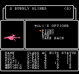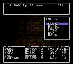 Balancing varies haphazardly in between ports. The NES version provides a very easy start; it’s no problem going right down to the second dungeon floor and kick some ass with an unleveled, unequipped party, which would have been suicide on home computers. Afterwards it gets harder quite fast, though. On the PC Engine the first floor is laughably easy as well, while on the second the party keeps running into enemies that formerly only inhabited the third, especially the dreaded ninjas, capable of beheading heroes with a single strike. Spell levels are also shuffled around each time. The later console versions mostly restore the balancing, though.