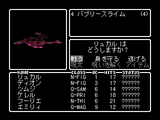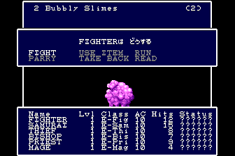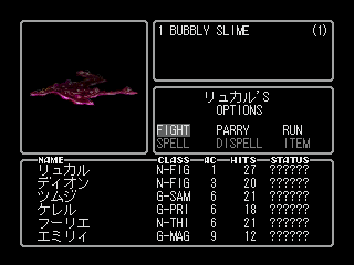 All Japanese versions feature a surprisingly rich set of options, as the player always has the choice to play in the trademark wireframe dungeons, and monster names, item names and status messages can be individually toggled between Japanese an English text. The 32-bit Lllylgamyn Saga even includes the home computer monster graphics, although not in the hi-res splendor of the PC-9801.
