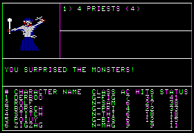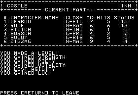 No need to start searching the manual for a quick load button, either, as Wizardry‘s most infamous feature is otherwise only familiar to fans of roguelikes: Permanent consequences. Wizardry automatically writes the updated status on disk after every single step. There is no save scumming – if your adventurers get obliterated by an out-of-league enemy group, they’re gone. Well, sort of. In theory, a fresh team of adventurers can arduously drag their predecessors’ bodies back into town and invest a tremendous amount of money in their resurrection. High-level priests can even try to resurrect their fallen comrades on their own. The process isn’t as well-proven and casual as in modern fantasy role-playing games, though, and the revenants are prone to rapid aging. They also might end up being reduced to dust instead, lost forever. No refunds.
