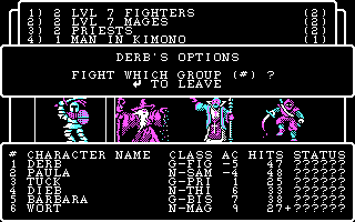 And that after all that effort that goes into building them up – all characters first have to be crafted by the player before jumping into the adventure. Although it is allowed to send single characters to their doom, it’s much more reasonable to have a full party of six ready, and a number of spares for those who don’t make it. (Traditionally, a save disk can hold up to character 20 slots.) Creating characters is somewhat annoying, though. After choosing a character’s race from the Tolkien / Dungeons & Dragons staples (Human, Elf, Dwarf, Gnome and Hobbit) and an alignment (good characters won’t join a party with evil ones, and vice versa), bonus points have to be distributed to six attributes to determine the classes available for the character. The problem: 19 out of 20 times it will be about 7-10 points, but very rarely the number can be much higher, even allowing characters to start the game as a Bishop or Samurai. But no matter which class you’re aiming for, of course the higher bonus is much desirable, leading to hundreds of discarded characters and hours of trial and error. The elite classes are also available when meeting their restrictions later, but changing the class makes the character age 5 years, and the attributes are reset to the race minimum without any bonus points, while the character keeps the achieved hit points and spells.