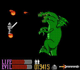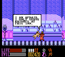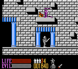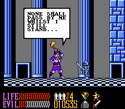 From a presentation standpoint, the graphics are definitely the nicest in the series and rank among the better NES games. They’re colorful and nicely detailed (compare the subtle cracked facades in the lower, poorer city areas versus the ornately-decorated knight guilds), and really help give a sense of time and place to the world. The boss designs are a step down from Ironsword, though, where they were screen-filling terrors; here, they’re mostly reduced in size but much more mobile and chase Kuros around.