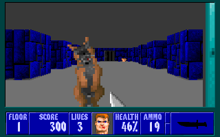 Wolfenstein 3D places you in the tattered prison uniform of Agent William J. “BJ” Blazkowicz, who has just been captured by the SS while attempting to infiltrate Castle Hollehammer in search of the war plans for “Operation Eisenfaust.” Unlike most FPS games, you’ll know your own face quite well, as it is displayed on the status bar, cautiously glancing from side to side and appearing increasingly bloody and bruised as you take damage. Armed with only a knife, a Luger and eight bullets, BJ must escape from Castle Wolfenstein, taking down whatever Nazis happen to get in the way.