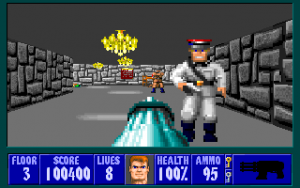 However, Nintendo of America’s notorious censorship guidelines bit Wolfenstein the hardest out of any game at the time, forcing id Software to remove all Nazi references such as swastikas, remove the dogs (these were replaced with giant rats instead), remove the blood (it is now “sweat”), and further de-emphasize the Nazi aspect of the game by making all enemy guards speak English (mostly just “Halt!” and “Stop!”) and removing Hitler’s mustache (he has also been renamed to “Staatmeister Meisterstaat”). Nintendo was also somewhat notorious for censoring religious symbols; in Wolf3D, you no longer collect jeweled crosses, but generic gold scepters instead.