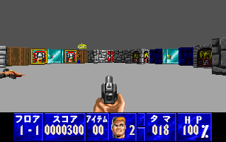 Wolfenstein 3D was released on NEC PC-98 in Japan by Imagineer. Since the PC-98 is basically an IBM PC with some different graphic and sound hardware, the port is pretty accurate to the PC version, and runs pretty much as smooth as can be. All the blood, swastikas, and Hitler mustaches are intact. The major difference here is that the text – even the menus – has been translated into Japanese. The “Read This!” file and mission debriefings are in Japanese as well. Much of these were cut back a little, though, especially the help file which is now only ten pages instead of the 20-some of the PC original. There is some text left untranslated, such as the messages from entering cheat codes. Interestingly, this version of the game can play the digitized sounds without having a Sound Blaster card installed (though it does support one), but without Sound Blaster, all the non-digitized sounds like item pickups revert to the bleepy PC Speaker versions. Since this is a direct PC port, there is no automap, and strafing is only controlled by the Alt key.