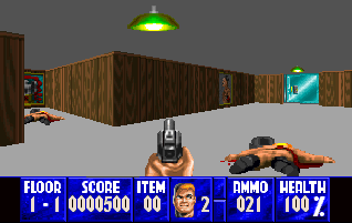 The most recent official port of Wolfenstein 3D is probably the most bizarre: Wolfenstein in HTML5. Yes, Wolfenstein 3D runs in a web browser (albeit a recent one, like Firefox or Chrome). It was written by John Carmack, to commemorate the imminent release of Wolfenstein: The New Order in 2014. The port is mostly the PC version, containing the first three episodes (the “Original Missions”) but not episodes four through six. The controls are slightly altered due to most browsers reserving the Control and Alt keys; firing and strafing are now on the X and Z keys instead. Though it renders at a low resolution, the game still manages to run surprisingly smooth for not requiring any browser plugins.