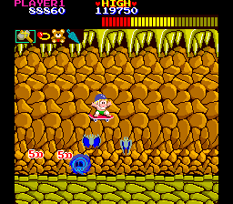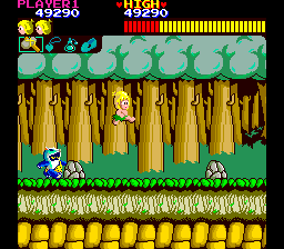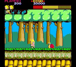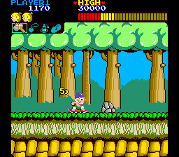 The main difference to Super Mario Bros. is that Wonder Boy is even faster paced. There is a power bar at the top of the screen, but it’s not a life bar. Rather, it acts as a timer, one that counts down remarkably quickly. The only way to refill it is by grabbing the pieces of fruit that are sprinkled liberally throughout each stage. Taking a single hit will kill you, though most levels are also littered with stones. These cause you to trip and, technically, while they won’t kill you they will deplete your power meter, and can potentially send you into a bad guy or right into a pit.