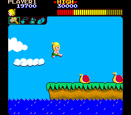 The first game, known simply as Wonder Boy, is a fast paced side-scrolling platformer, and was published and distributed by Sega. Hudson then obtained the rights to port Wonder Boy, but decided to replace the main character with a goofy version of Takahashi Meijin, a real-life spokesperson for the company. They rounded out his face, stuck on a baseball cap, and gave him the same grass skirt as Wonder Boy. Developed for the Famicom and NES, it was known as Takahashi Meijin no Boukenjima in Japanese, and Adventure Island in America.