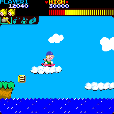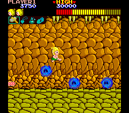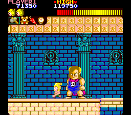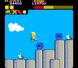 The original Wonder Boy was initially released in the arcades, for the Sega System 2 board. As caveboy Tom-Tom (named Boy or Bocke in Japan), the goal is to rescue your green haired girlfriend Tanya (Tina in Japan) from the evil lord Drancon (“Kings” in Japan). The gameplay is patterned after the ever popular Super Mario Bros. – you run forward, jump over bad guys, and leap across moving platforms. There are seven worlds, each containing four stages, and each ending with a brief boss battle against Drancon.