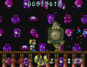 Graphically, nothing in Wonder Dog looks like it only could have been done on a CD, but it makes up for this with some remarkably creative visuals and varied level design choices. The first three levels take place on Earth, bringing you through fun locations like a city full of dogs and a scrapyard where you use old mattresses to bounce around. Once you get off of Earth, Wonder Dog decides to make some stops at some pretty entertaining places on the way to Planet K-9, even if it seems to be for no real reason at all. Loony Moon takes the old proverb of the moon being made out of cheese and brings it to an extreme by having you deal with the mice that have now made it their home. Planet Weird lives up to its name incredibly well, containing an unsettling combination of goofy faces on a black background and platforms made out of humanoid bodies holding each other up. Planet Foggia is the smallest section of the game, but it has you completing a boss rush against aliens that specialize in smoke and fog attacks. After all this, you finally make it to Planet K-9 and take on the Pitbullies themselves, which is arguably the least interesting portion of the game since it doesn’t really introduce anything as humorous or bizarre as what came before it. Boss fights tend to be simple affairs, usually against a human, an alien, or some kind of machinery, but some of their designs are fun and they’re massive, well-animated sprites that visibly react to taking damage.