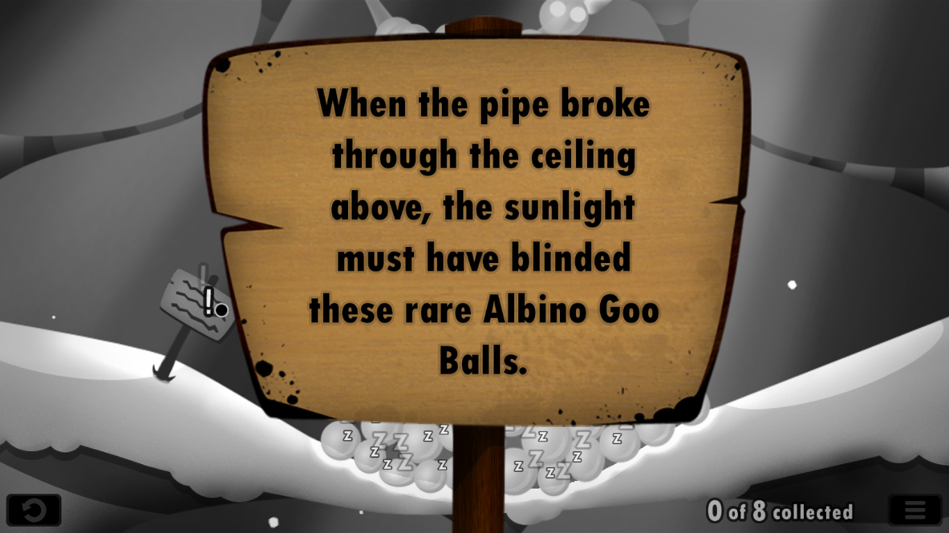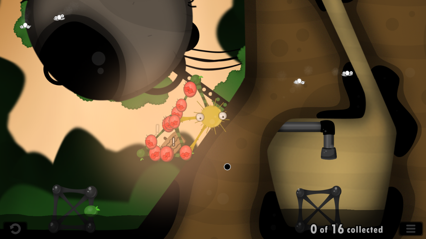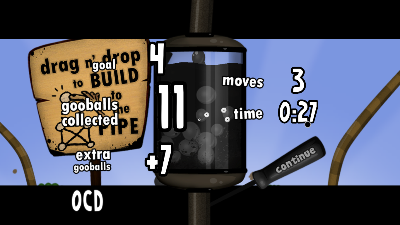 This all helps the game create a sense of personality all its own, only recaptured in Gabler’s later projects, and it makes the main puzzle gameplay more enjoyable in the process. The smooth and occasionally bouncy soundtrack helps, never distracting you too much while you’re trying to figure out a solution. The goal of every level is to get the goo balls to the pipe at the end, a few end of chapter parts switch up the goal, but the method to accomplish that goal is always the same. Goo balls connect to each other, allowing you to create structures that goo balls not used for the construction of the structure travel through. The challenge comes in through the in-game physics, as structures get their own weight and mass, shifting around based on their weight distribution. You also have to take into account how many goo balls you use, because a set amount have to get into the pipe, and that’s only possible if they weren’t used during construction. Trying to get all the OCD flags is also a genuine challenge few other puzzle games will offer, forcing you to think extremely carefully on how to create your structure in the most goo efficient way possible.