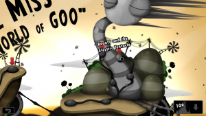 The game’s narrative is expressed like you’re being read a story book, with bits of writing mixed in during stages given by signs created by the mysterious sign painter. Little living goo blobs start to venture through the world, reaching for odd pipes littered through the land, and its eventually revealed that the powerful World of Goo Corporation is gathering the goo blobs to create energy sources and different commercial products (a thinly veiled commentary on the oil industry and crass consumerism). The environmental and economic commentary is very blunt, but in a charming and quirky wrapping, complete with cute self-aware jokes and fun alliteration that humanizes the world and everyone living in it. Even the art has an ugly yet cute quality to it, never going into full cynical satire while remaining critical of various aspects of modern life.