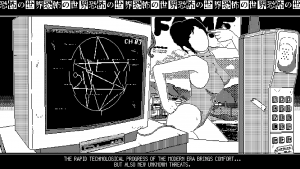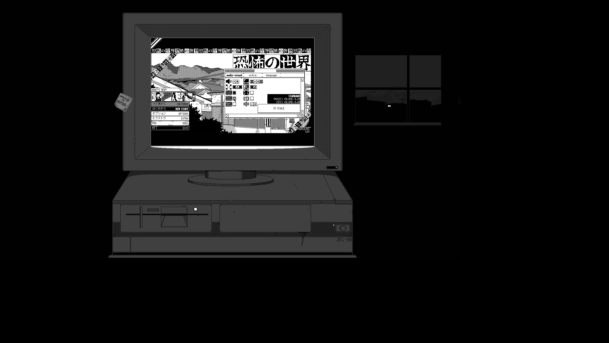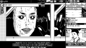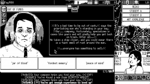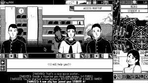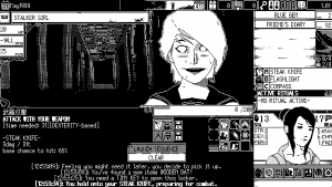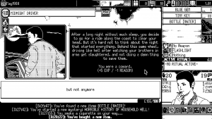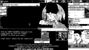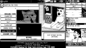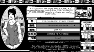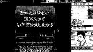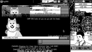 The game’s big draw is the 1-bit graphical illustrations literally made in MSPaint, filled with an incredible amount of detail in every aspect to make an early Mac style interface via 80s Japanese PC game menu design. The 2017 early build was already striking at the time, but looking at what we have as of this finished release is like night and day. You can spot a few similarities, but there’s been a lot of effort in making character sprites and hub design more detailed and polished.