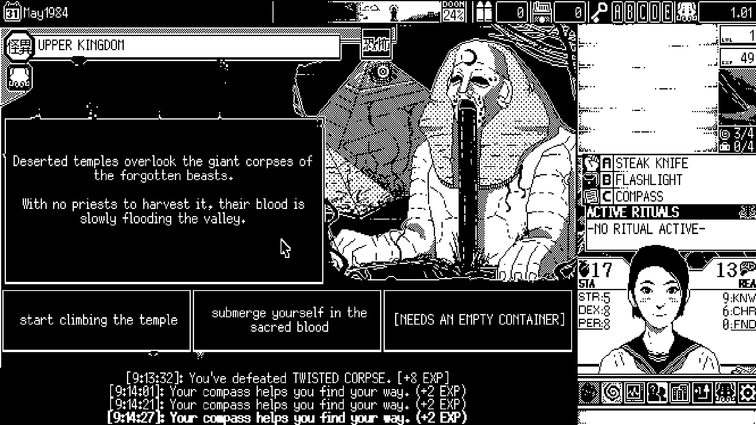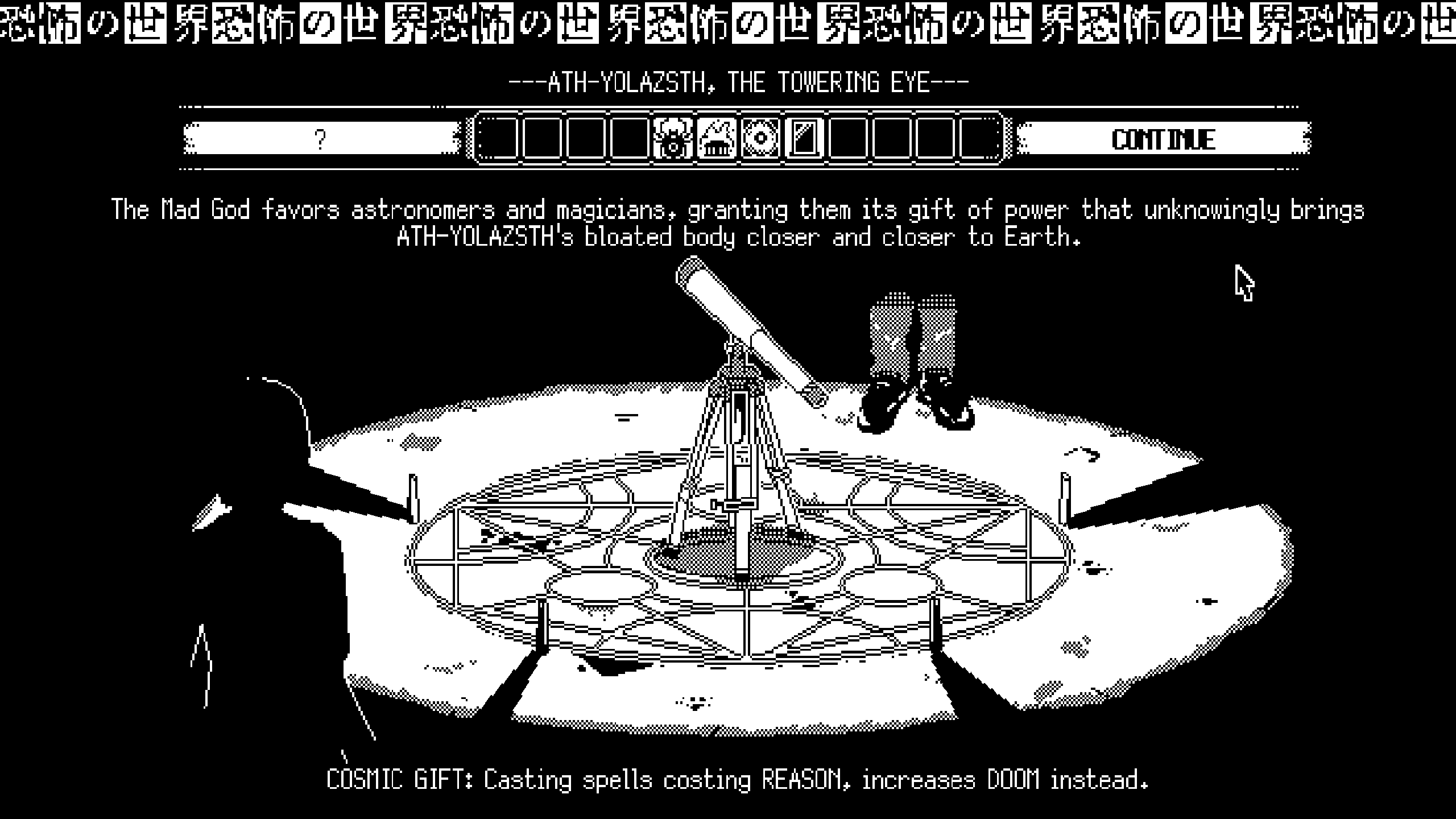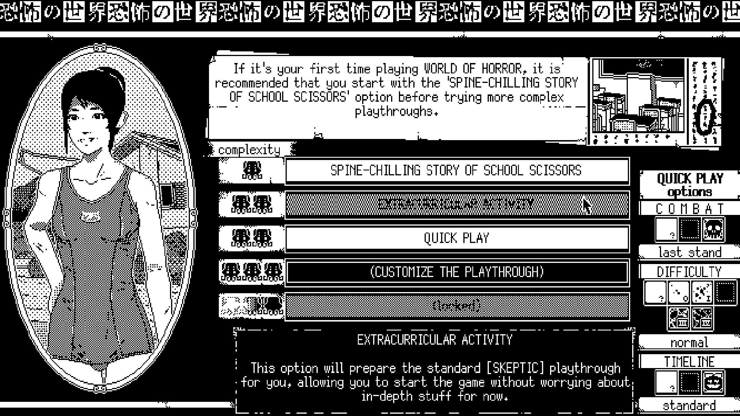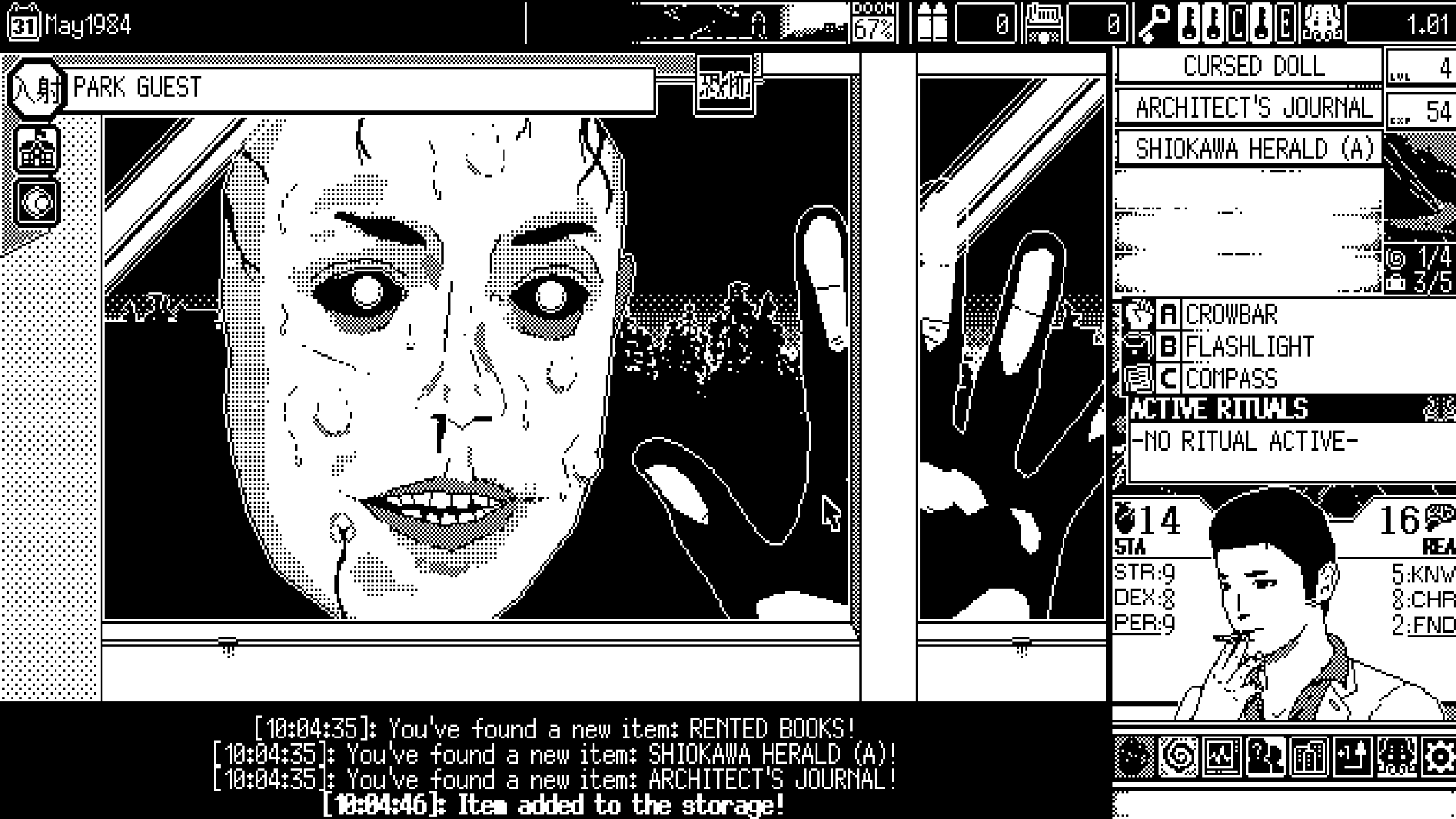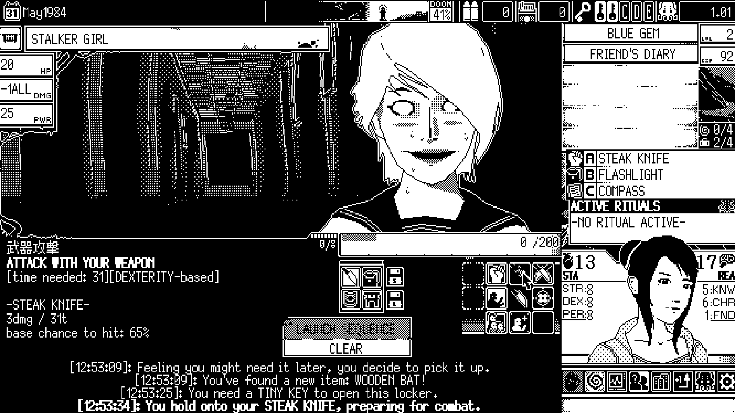 For those new, WORLD OF HORROR is a roguelike RPG done in the style of the works of horror manga icon Junji Ito, with a dash of H.P. Lovecraft eldritch horror. The idea is that it is the year 198X, and an eldritch god is being drawn into the world, which will mean the end of all things if it happens. You have to go through a handful of cases to figure out connections, gain keys to a lighthouse at each case’s end, and get to the top to banish the god and save the world. Easier said than done.