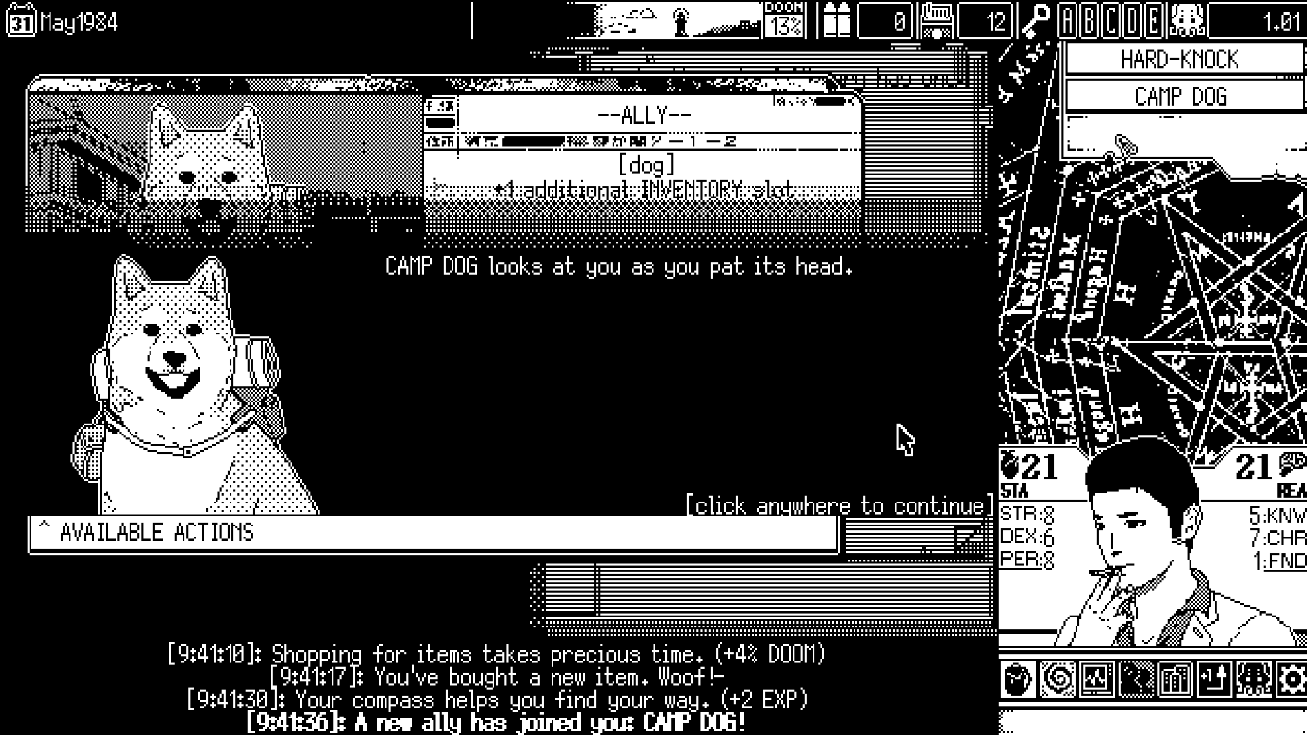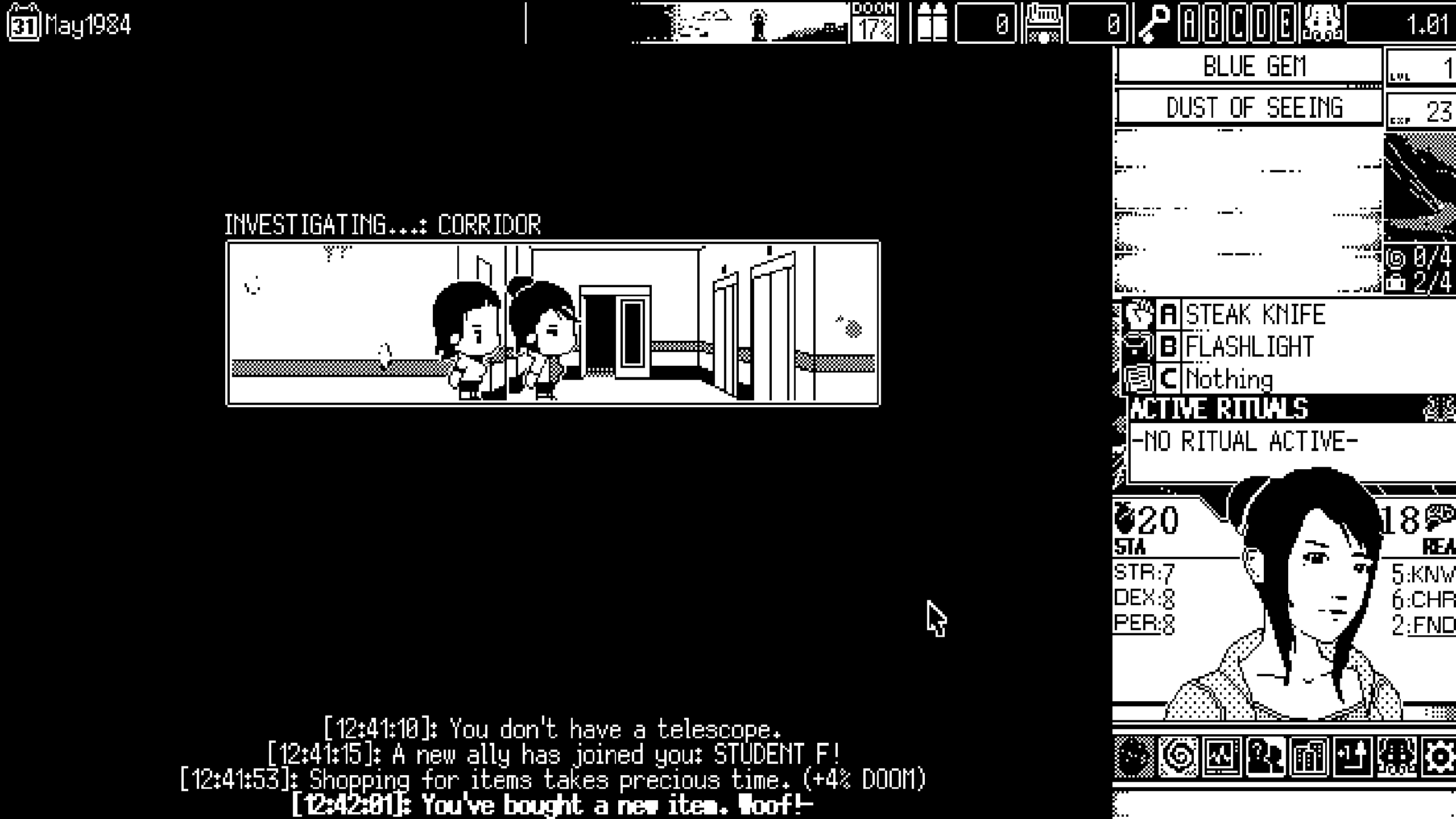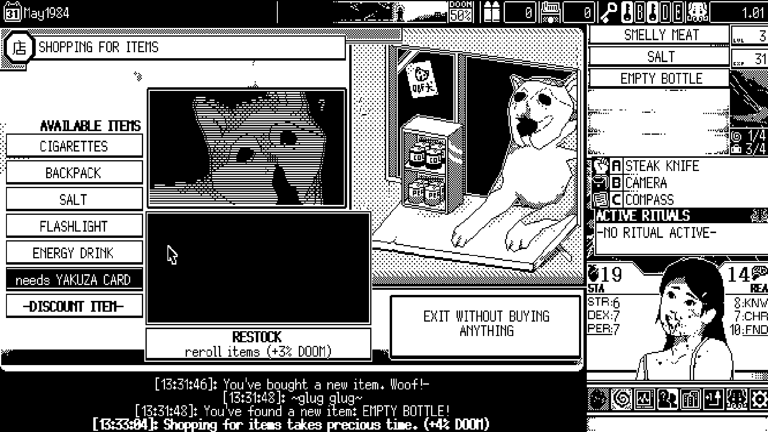 Along with your various stats that you can increase on level ups, you have stamina and reason, acting as your physical and mental health pools, often lowering with events that test you in those areas. If one of those goes out, it’s game over, time to start another run. On top of that, there’s a doom meter slowly increasing with your actions being counted on the top of the screen via a bar that shows a void overtaking the lighthouse. If that hits 100%, the god you’re trying to stop arrives and destroys the world. Actions like looking for followers at the school yard or visiting the shiba-inu run shop can also increase the doom meter, so it’s rare you’re safe from that growing doom.