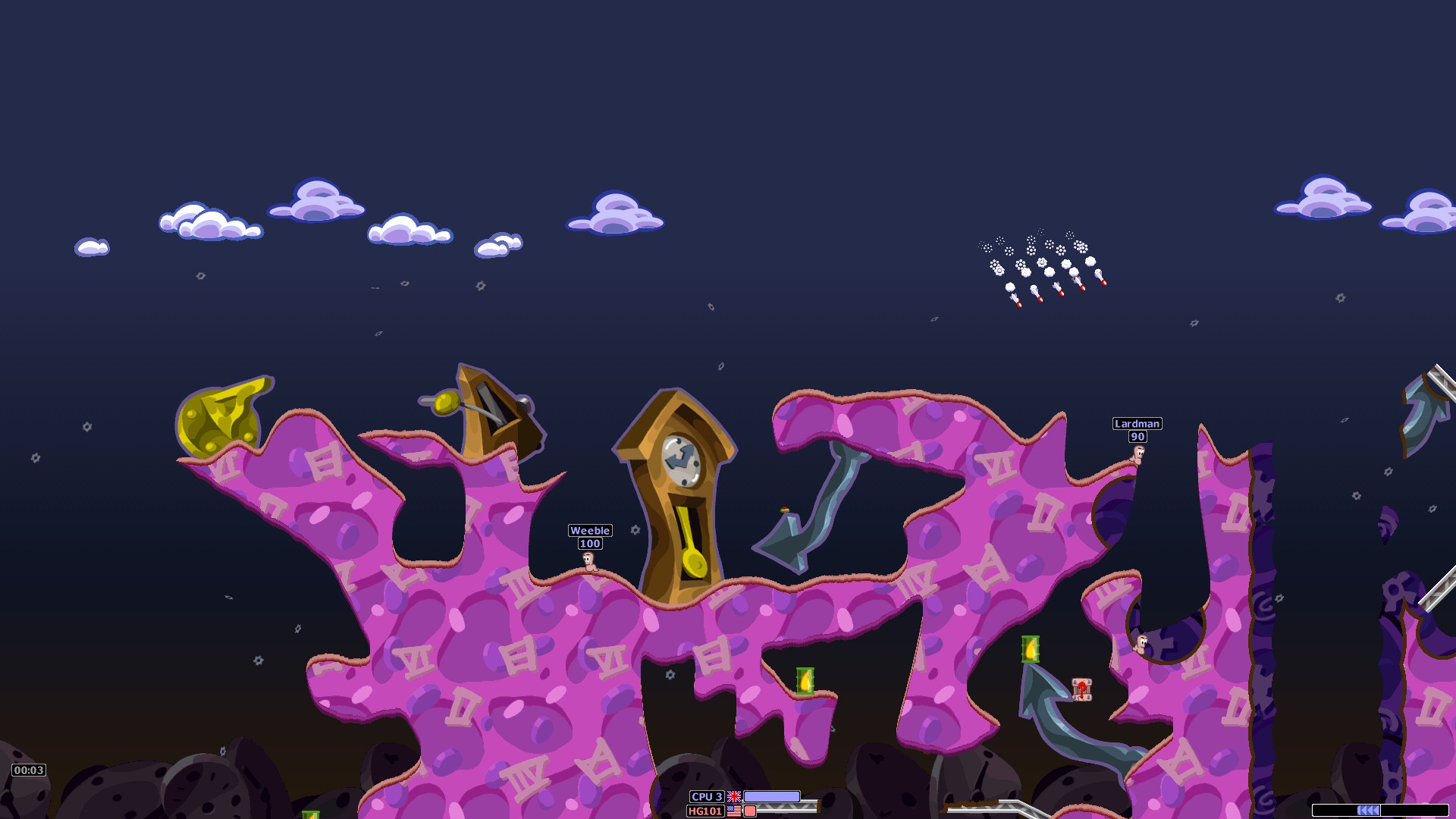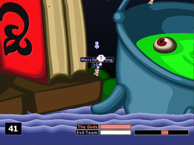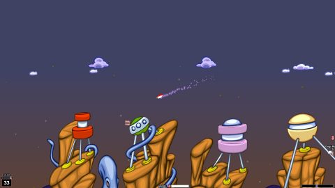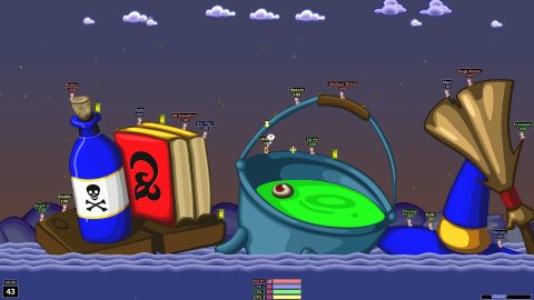 What Armageddon can offer you most of all, though, is weapons – a staggering amount, unmatched by any game before, and exceedingly rarely since. Some of the more interesting tools of death includes the battle axe, a melee weapon that halves the opponent’s HP – making it more dangerous the healthier a foe or group of foes is. The longbow is far weaker than more explosive weaponry, but has far less of a risk of collateral damage, has incredible range, and can be used to create makeshift platforms with its arrows. You might also want to throw out the occasional skunk – it’ll trot forward and leap gaps the way a sheep does, but leave behind a cloud of stench that poisons any worm caught in it, draining their health turn by turn. Each team now also has access to one unique special weapon, offering extra benefits beyond the usual kit, while not quite being quite as devastating as the rarely found superweapons.
