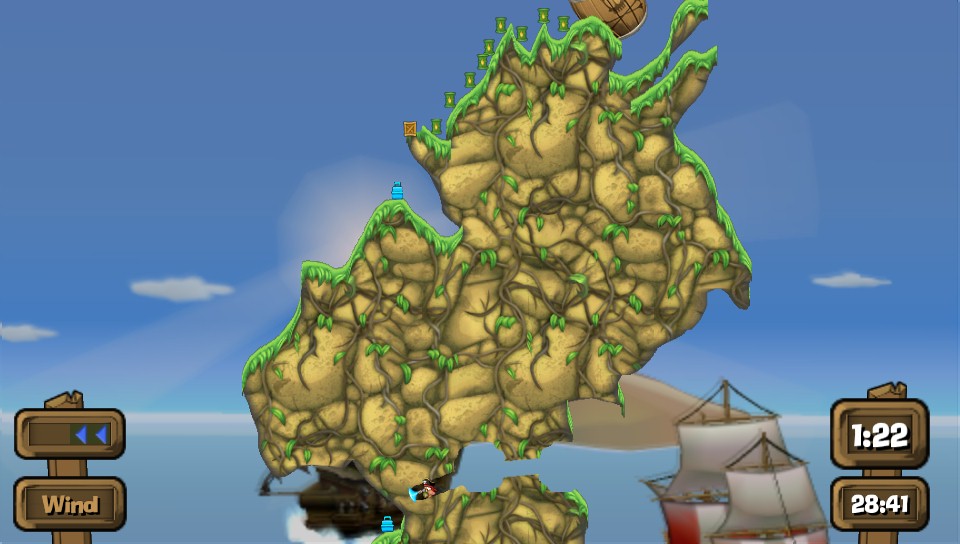 Electromagnets are also pretty fun to use, if far more situational in their use. While they only remain active for a few turns, they’ll either repel or attract magnetic objects like grenades and bazooka shells, thus making targets easier or tougher to hit. While both sentries and magnets can be placed upon the terrain by your own team, there’s the usual assortment of new weapons to use as well. The lightning strike makes for an extremely versatile tool, damaging worms underneath its cloud, turning sentry guns against their creators, and most valuable of all, bringing a worm back from the dead. The boomerang only gives worms a light shove, but is great for grabbing long range crates with the chance of getting your ammo back.