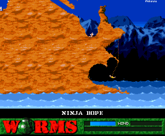 Perhaps the most versatile tool of all Is the “ninja rope”, which can be fired out to any surface above your worm. On paper, it’s meant to be used to swing across gaps and carefully lower yourself from a high up position. With the right conditions and enough of an overhang, it’s also possible to build up enough speed to swing yourself up onto higher ground and a better tactical position. At this point in the series, however, it’s rare that you’ll have enough of a horizontal surface above your head to use the rope to its full potential. It’s something to be kept in mind, however, as following games give more and more reasons to use it against your enemies. As it stands here and in the future, care must be taken – the rope requires far more manual dexterity than almost anything else in the game, and using it poorly is likely to fling your worm into a watery end.