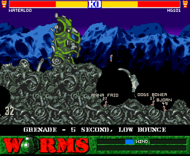 Whatever damage you land upon friendly and enemy worms alike is subtracted from a worm’s typical pool of a hundred hit points. Once a worm runs out, they’ll pull out a plunger, announce their exit, and detonate themselves, causing a small amount of damage to the landscape and any nearby worms. Friendly fire is always in effect, which means that explosions of this and any other kind can damage and take out other worms, leading to potential chain reactions for teams grouped too close together. Incredibly satisfying when it happens to your enemies, much less so when your worm is the one caught in the crossfire. Explosions and certain other weapons will also send worms flying in various directions, quite possibly dragging more worms in their path with them into an even worse situation.