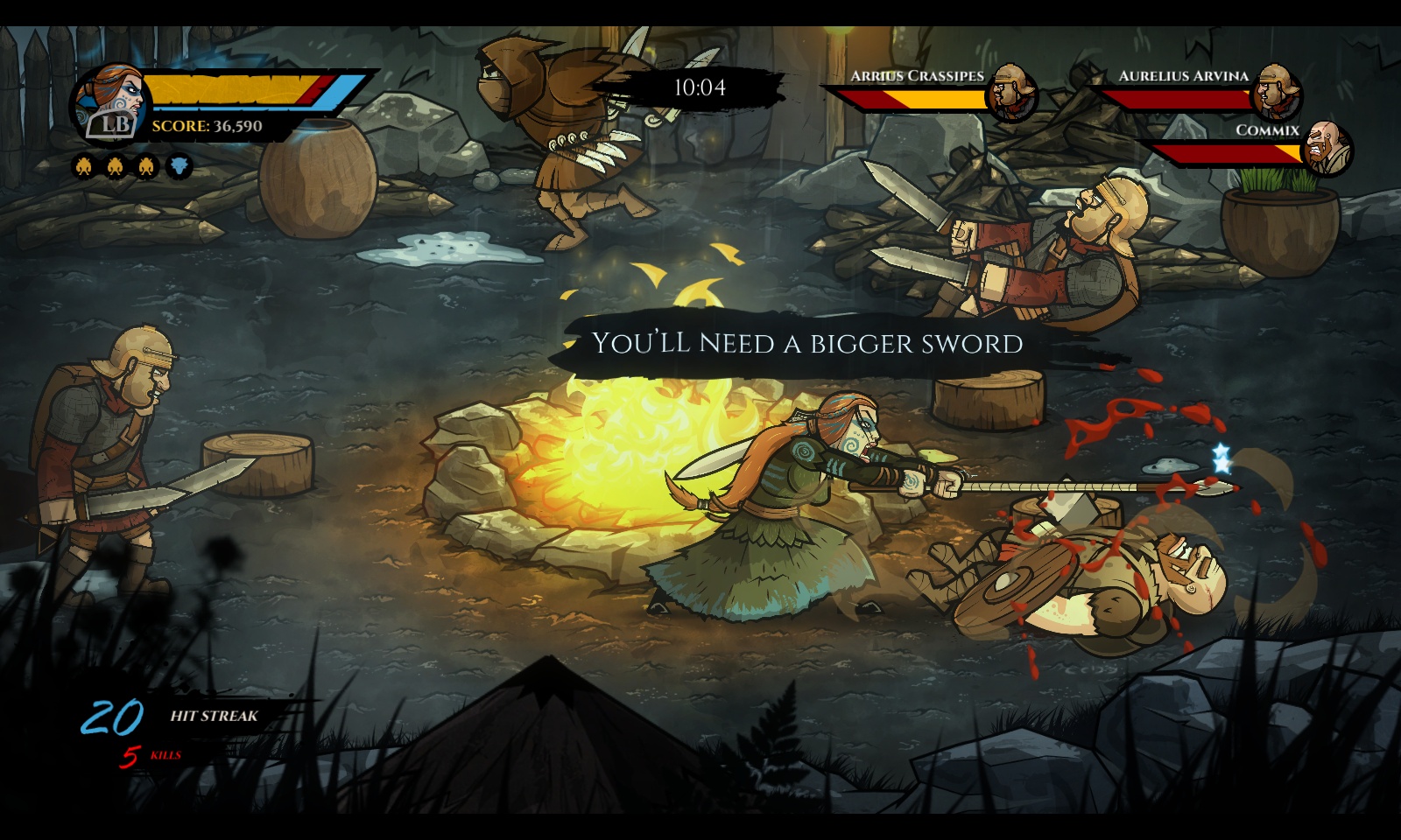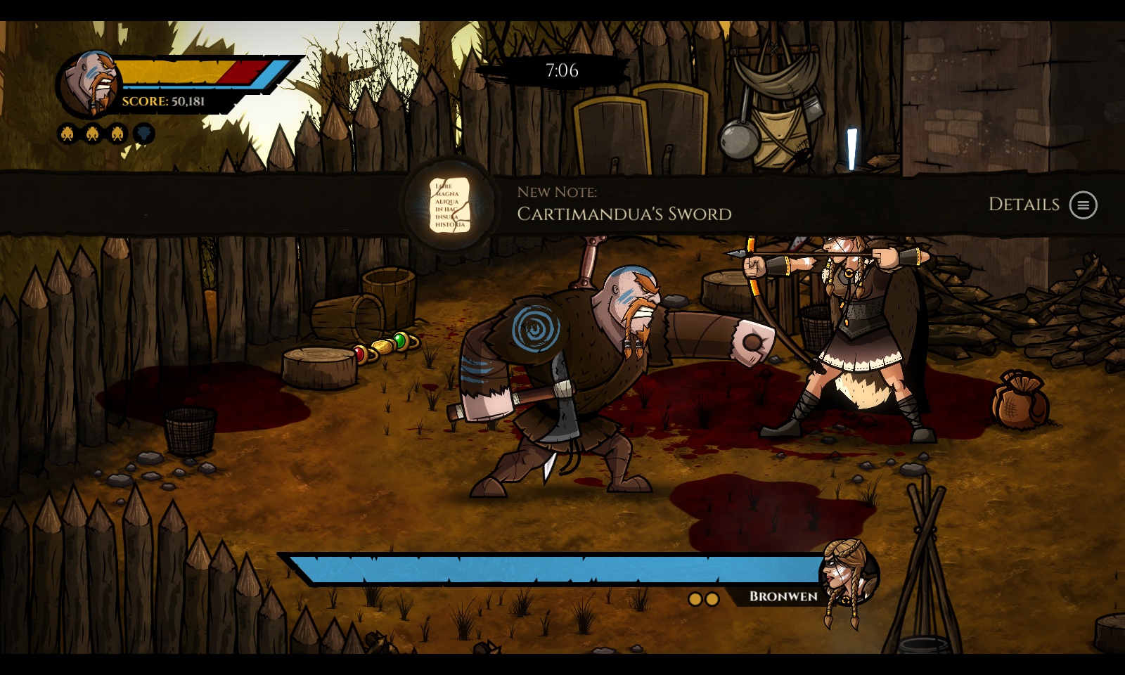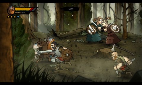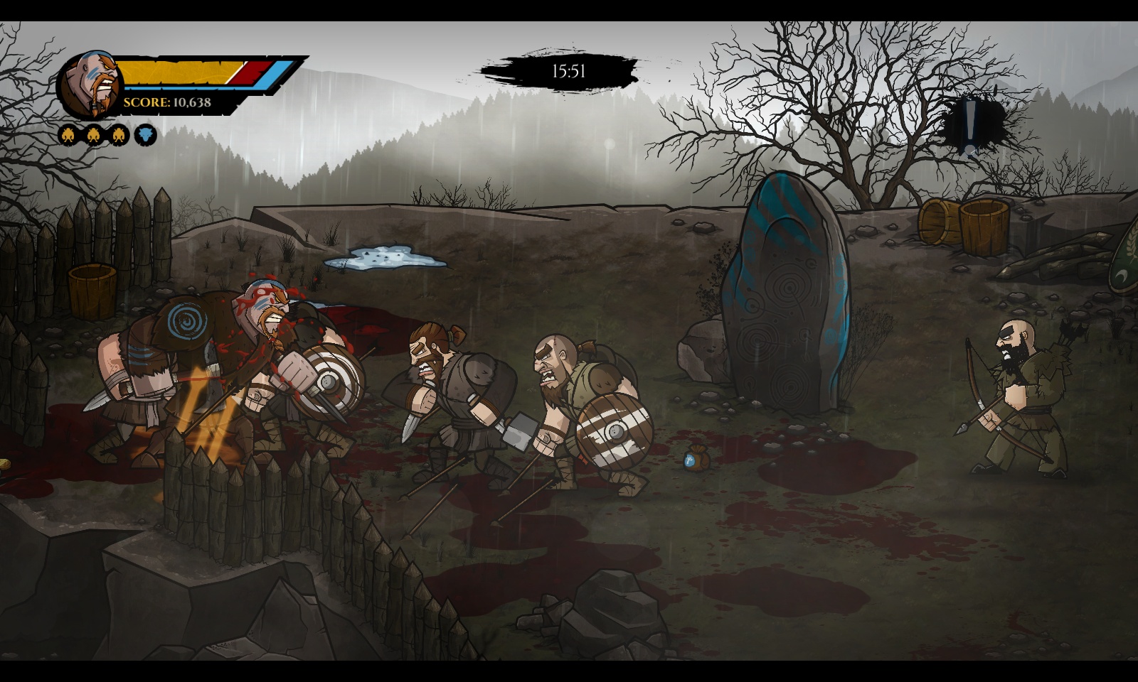 Rather than going the retro pixel route like Fight n’ Rage or Scott Pilgrim, Wulverblade goes for a more modern approach, using higher resolution drawings over a skeletal animation system. The style is similar to Klei titles like Mark of the Ninja and Shank, in that they’re cartoonish but also extremely violent – in the game’s many cutscenes, most of the trios are soaked in the blood of the enemies. It also serves as a contrast to Castle Crashers, which uses a similar Flash-style animation, but its gore is comical, compares to the brutishness presented here.