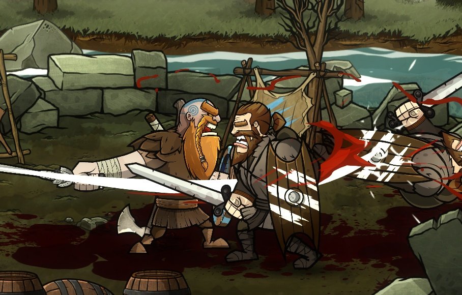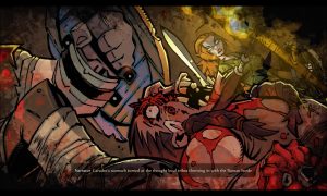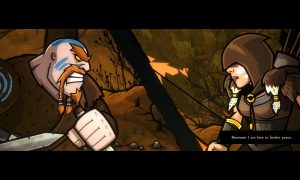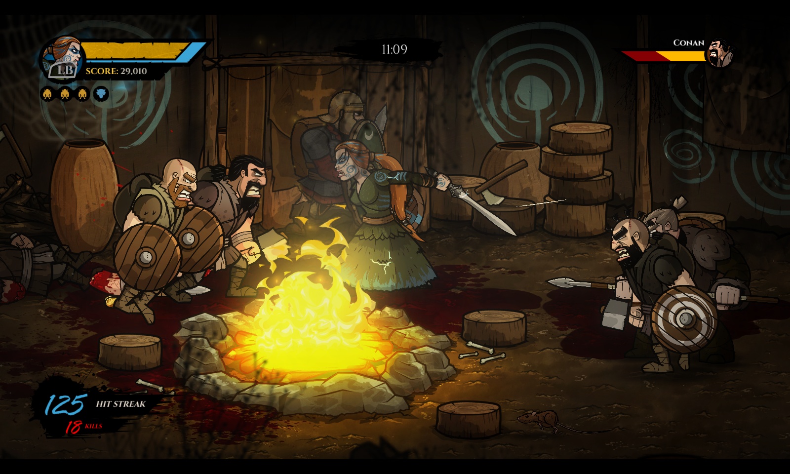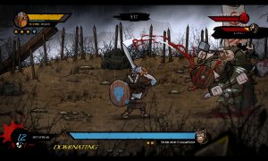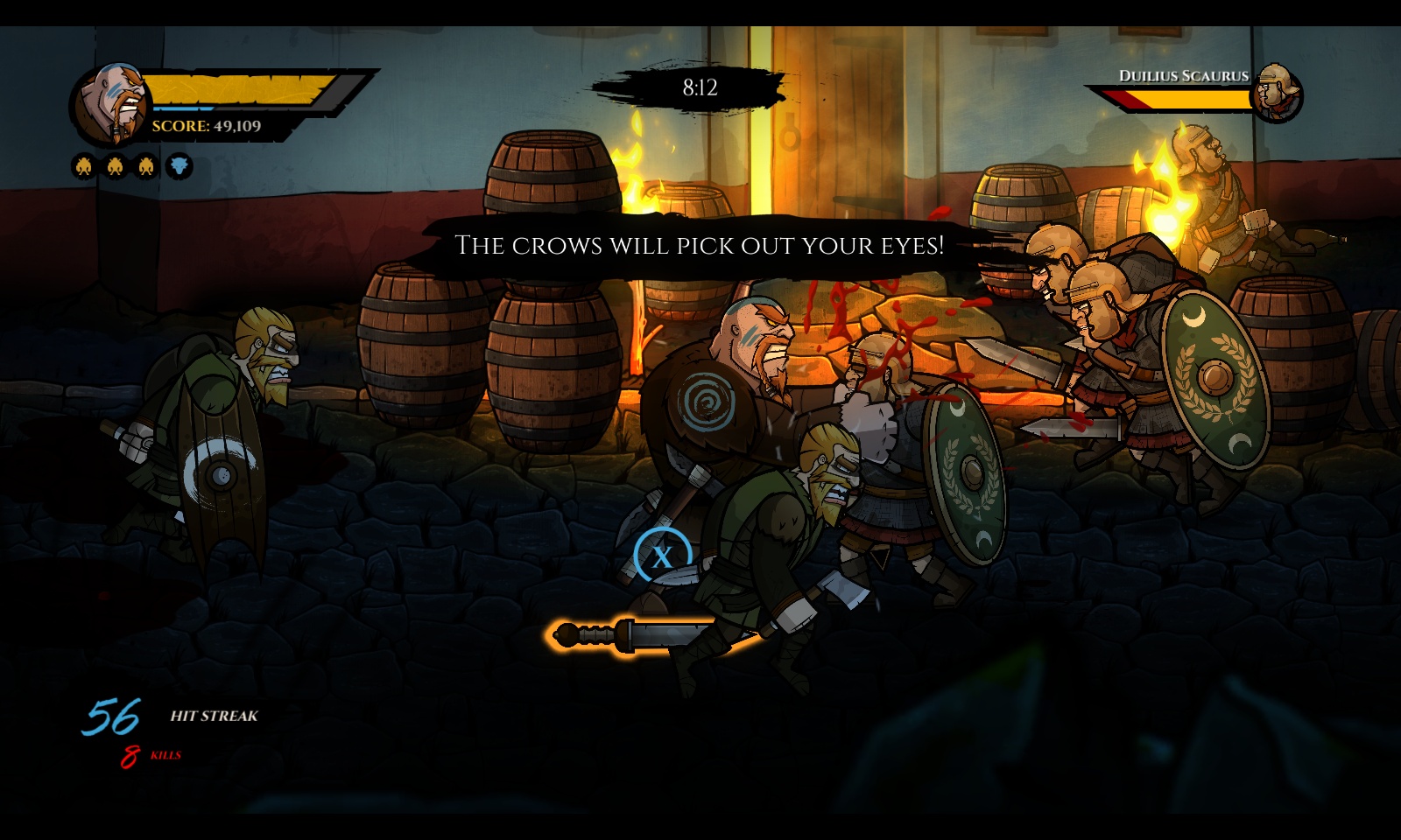 Rather than going the retro pixel route like Fight n’ Rage or Scott Pilgrim, Wulverblade goes for a more modern approach, using higher resolution drawings over a skeletal animation system. The style is similar to Klei titles like Mark of the Ninja and Shank, in that they’re cartoonish but also extremely violent – in the game’s many cutscenes, most of the trios are soaked in the blood of the enemies. It also serves as a contrast to Castle Crashers, which uses a similar Flash-style animation, but its gore is comical, compares to the brutishness presented here.