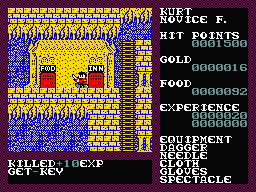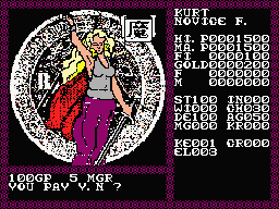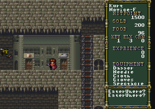 You also need to keep track of your Karma stat. Every enemy in the game is classified as either “good” or “bad”, even though they all will attack you. If you kill too many “good” enemies, your Karma will raise. There are a few other things that will increase too, like saving the game when you don’t have any money. In order to lower your Karma, you need to drink poisonous black potions, which deplete a good chunk of your HP. These potions cannot be purchased and must be found during exploration. None of this really makes any logical sense, of course, but so it goes. Keeping your Karma low is important for many reasons, as you can’t enter the final dungeon or get the Dragon Slayer sword unless it’s kept under control.