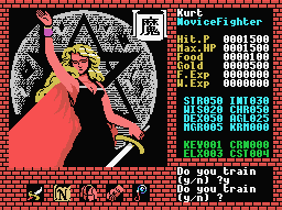 The game was ported to both the MSX (on cartridge) and MSX2 (on disk). The graphics are lower resolution, but in general it actually looks a bit better. Curiously, the MSX cartridge version is actually an improvement over the MSX2 version – it looks nicer, for starters, as the MSX2 version sticks to a color palette similar to the PC-88 version, plus the cart version adds unique backgrounds for the bosses. The cartridge also has an entirely different (and expanded) soundtrack that was written by Mieko Ishikawa and Yuzo Koshiro which utilizes PSG synth, rather than the FM music of the PC-88 game. In most versions, you’re given money from the king, which is used to allocate points in certain fields. The MSX version just gives you points directly (and less money), because in this version only, you can return to the town to further improve your stats. Items can only be bought at a hidden shop in the first training ground area. Items are cheap, except in the MSX version, where they are prohibitively expensive. The load times are also eliminated, plus it includes the ability to save your game.