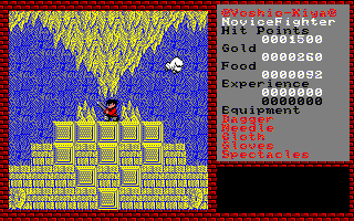 The look of the game should be familiar to fans of the NES game Legacy of the Wizard, which is actually the fourth game in the Dragon Slayer series. Each dungeon is several screens tall and several screens wide, though it loops horizontally. The goal is to not only find the exit, but gain enough strength and find enough equipment that will allow you to defeat the boss, before moving onto the next dungeon. There are ten dungeons in total. The game auto saves at certain points, but you can also save your game at any time at the cost of some gold. Navigation is incredibly confusing, considering there’s almost no real logic to the placement of platforms. You can climb up and down ladders, but can only “jump” a single square. Finding hidden rooms plays a big part in progressing too. This being an old computer game, the characters move a single tile at a time, so the movement feels very choppy.