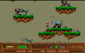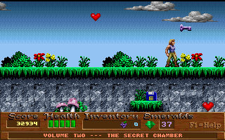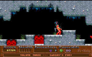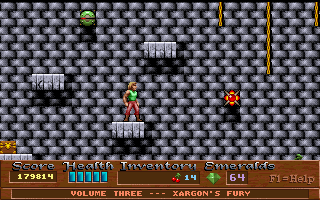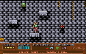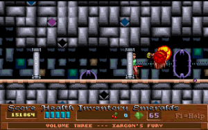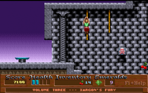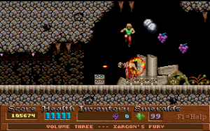 Xargon is the successor to Epic’s previous, better-known platformer, Jill of the Jungle. Like Jill, it is divided into three episodes, with the first available as shareware. It also borrows numerous elements directly from Jill, such as collecting giant fruit for a health bonus, animal transformations, giant rolling boulders, an evil laugh as the death sound and, unfortunately, the frustratingly-stiff controls. Of course, you would never question the more whimsical elements from Jill because the game is meant to be silly and fun. Xargon, however, takes on a much more serious tone, and yet you would never think of questioning the giant floating fruit or the fact that you can shoot laser beams and boulders out of your chest. Why? Because in context… it actually makes sense.