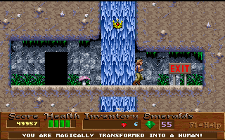 Unfortunately, however, there are certain levels that break the overall feel of the game. In the levels that take place in Xargon’s factories and castles, the vivid fantasy landscapes and enemies are replaced with what feels closer to hard science fiction. Naturally, of course, the boss battles (or the closest thing this game has to them) all take place in such areas, which is a bit of a let-down. They also decided to change the colors of certain things for the third episode, most notably giving Malvineous a change of clothes. But as this effect is achieved through a lazy palette swap, the color of Malvineous’s eyes is changed as well, giving him a rather demonic appearance.