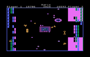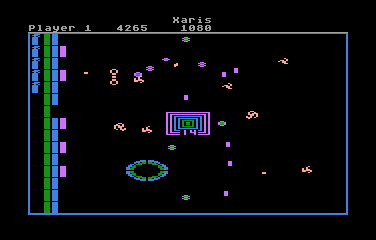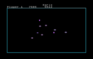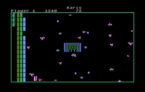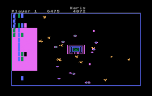 If there’s one game that this could be compared to, it might be Breakout, or at least its opposite world counterpart. You and another potential player both control paddles, and each player has several rows of bricks on their side of the screen. (You can also have an AI take the role of one or both players, and surprisingly, it can hold its own pretty well.) The surprise, however, is that you’re trying to protect your bricks from being destroyed, and should ever lose them all, it’s game over. Instead, your goal of each of the 32 waves is to destroy all the Xaris, the little amoeba-like spheres that crawl around the screen. Meanwhile, fireballs constantly spawn in, and should they bypass your paddle, they’ll start to take out your valuable bricks.