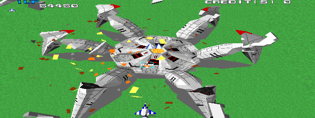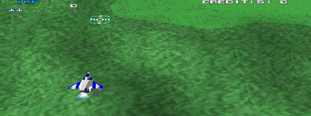 Xevious 3D/G was released in arcades in 1996, and shortly thereafter on the PlayStation, under the title Xevious 3D/G+. The graphics are again 3D and pretty bland (despite the use of the PlayStation’s high resolution mode, which was uncommon for the time), but the game returns to the formula of a traditional vertical shooter, instead of the first-person viewpoint of Solvalou. The player ship can now equip three very powerful weapons, including a massive laser and a homing electric tentacle, which may target both air and ground enemies. It’s still possible to bomb the ground in search for SOL towers and such, but much of the original’s charm is gone: the game is more of a nostalgic homage, and doesn’t feel like a real sequel. Still, it’s hard to complain when the music score is composed by Ayako Saso and Shinji Hosoe.