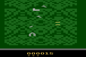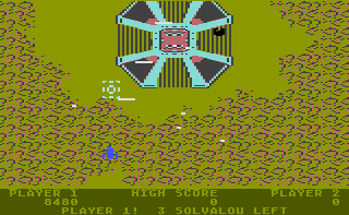 Xevious didn’t reach the American NES before 1989, leaving the market open for other efforts. Atari planned ports of Xevious for both the 2600 and 5200: they were never officially released, but prototype ROMs can be found out there. The 2600 version is as crude as one would expect, losing most of what makes the original game memorable. It has only two enemy types, one on the ground and one in the air, and a very repetitive environment. The 5200 game contains all the major elements and even supports two-button joysticks for the two weapons, but everything moves very slowly. The stage layouts are notably different from the arcade game, and look rather boring. Finally an Atari 7800 port was eventually marketed in 1987, and while it’s a fine port for the system’s standards it went as ignored as the 7800 itself. Other than the unreleased 5200 version, both weapons are always fired together with one button, which would be true for most of the home computer ports, too.