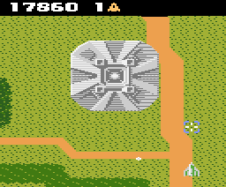 Some of the ground targets are motionless installations and can’t harm you in any way, so they’re there solely to be bombed and earn points. The Zolbak in particular is worth a mention. Also known as “Detector Dome”, it’s an installation that collects data for the GAMP army. In a fashion that would be later reprised by Compile’s Zanac series, Xevious is programmed to react to the players’ behavior. When they are too proficient at killing a certain kind of enemy, the AI will send other kinds. Similarly, when the score increases, the waves of enemies intensify. Bombing a nearby Zolbak, however, reduces the enemy forces’ aggressiveness for a while, making this otherwise harmless object a priority target for survival.