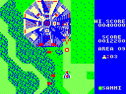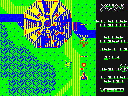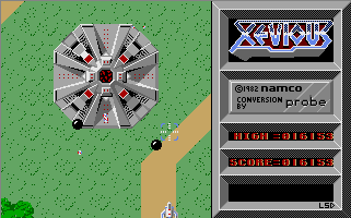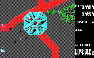 The only US-made computer port was for the Apple II, which strays a but further from the original with the stage layouts, but isn’t too bad considering the technical limitations on one of the oldest home computers. In Europe, U.S. Gold secured the Xevious license, and brought it to all the popular systems. Most of these were programmed by Probe Sofware. Like most other computer ports, the Amstrad CPC version uses one button for both weapons, but only the bombs are fired in semi-automatic mode. The stages have been modified again, and now every segment is really long, slow and boring. The ZX Spectrum port has the same stages as the CPC, but runs much faster and more fluid. The improved performance is bought with the typical monochrome playing field, though. The Commodore 64 port seems to have not been programmed by Probe, but it’s also quite bad, mostly for its very sketchy hit detection. Probe Software also made a conversion for the Atari ST, which has very obnoxious sound effects, but otherwise is very faithful to the arcade game.